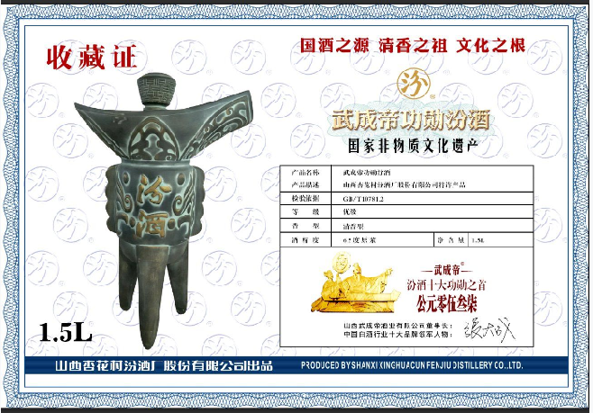武成帝功勋汾酒由国家级非物质文化遗产酿造班组手工酿造,经国家级酿酒大师和国家级品酒大师团队层层把关;景德镇国家级工艺大师和深圳国家级设计师鼎力打造,集汾酒文化、帝王文化、青铜文化、收藏文化、道家文化为一体,突出体现了汾酒产业报国、开拓奋进、匠心酿造的传承与创新。是汾酒家族中又一颗璀璨的明珠。